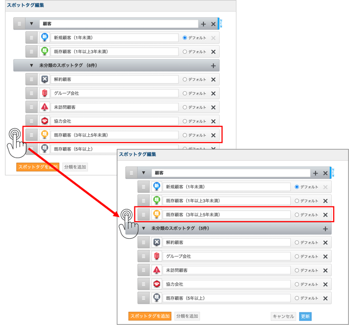- 作成したタグ分類の下に、既存のスポットタグの「≡」をドラッグ&ドロップして移動することができます。