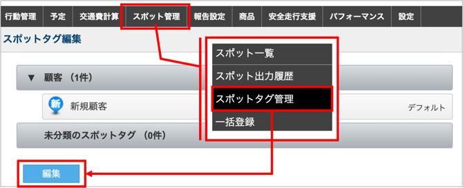 - 管理サイトにログイン後、[スポット管理]>[スポットタグ管理]でスポットタグ編集画面を開きます。