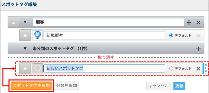 - スポットタグ分類を削除するには、「編集」をクリックし、スポットタグ分類名横の「×」で削除します。削除後「更新」をクリックすると変更が反映されます。