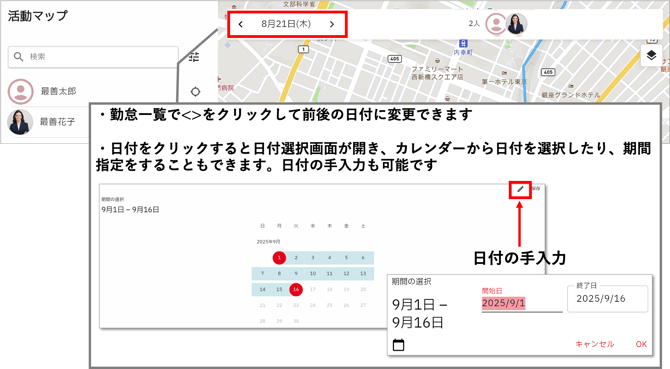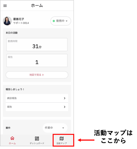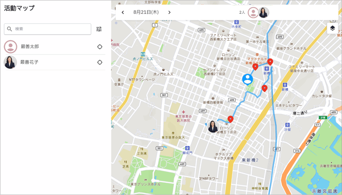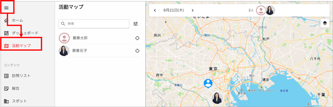 活動マップは、ユーザーの活動や訪問先を地図上に表示して確認できる機能で、「誰が・どこで・どんな活動をしたか」をリアルタイムに把握できます。