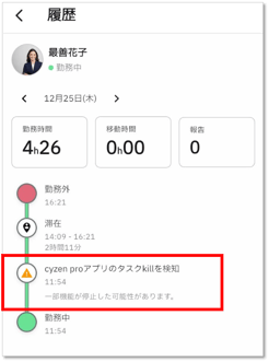 ※ アプリがタスクkillされた場合、1日の活動の履歴の中に表示されます。タスクkillを行うと、位置情報取得などの一部機能が停止された可能性があります。
