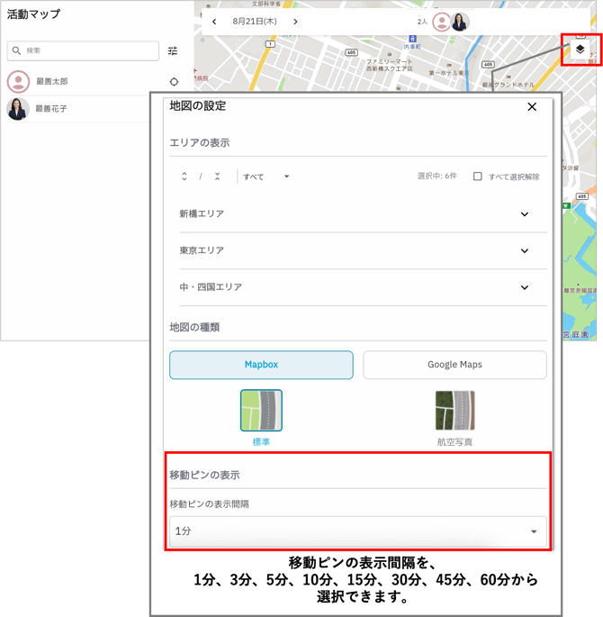 地図設定で、エリアを表示させたり、地図の種類を変更したり、移動ピンの表示間隔を変更することができます。(エリアの表示についてはこちら)