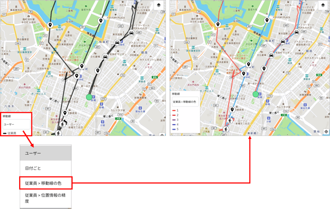 移動線の色をユーザーごとに登録しておくことで、誰の移動線か判断しやすくなります。活動マップ左下の移動線で表示方法を「移動線の色」に切り替えます。