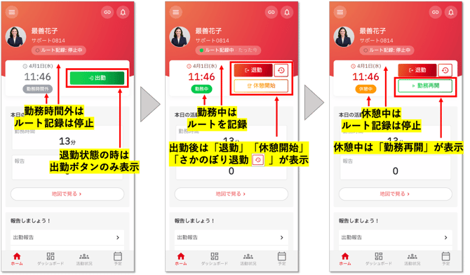ホーム画面上部に表示されているボタンから勤務状態を選択します。