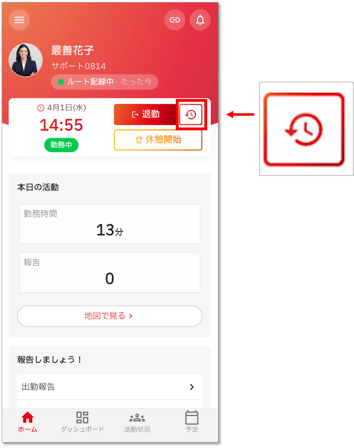 さかのぼり退勤は、ホーム画面の退勤ボタンの横に表示された時計マークから行います。