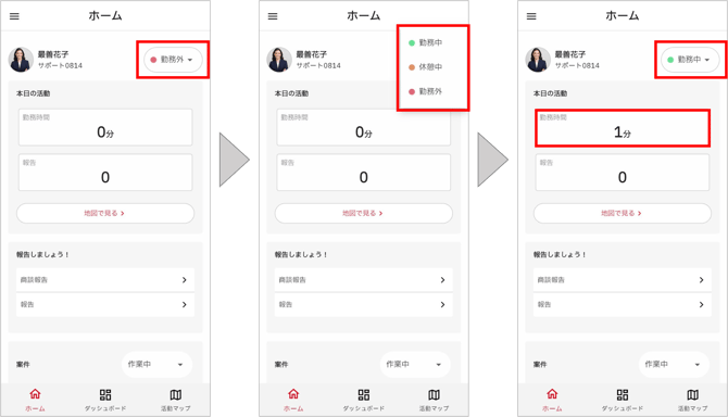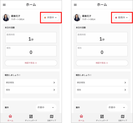 ホーム画面右上で「勤務中」「休憩中」「勤務外」を切り替えることができます。