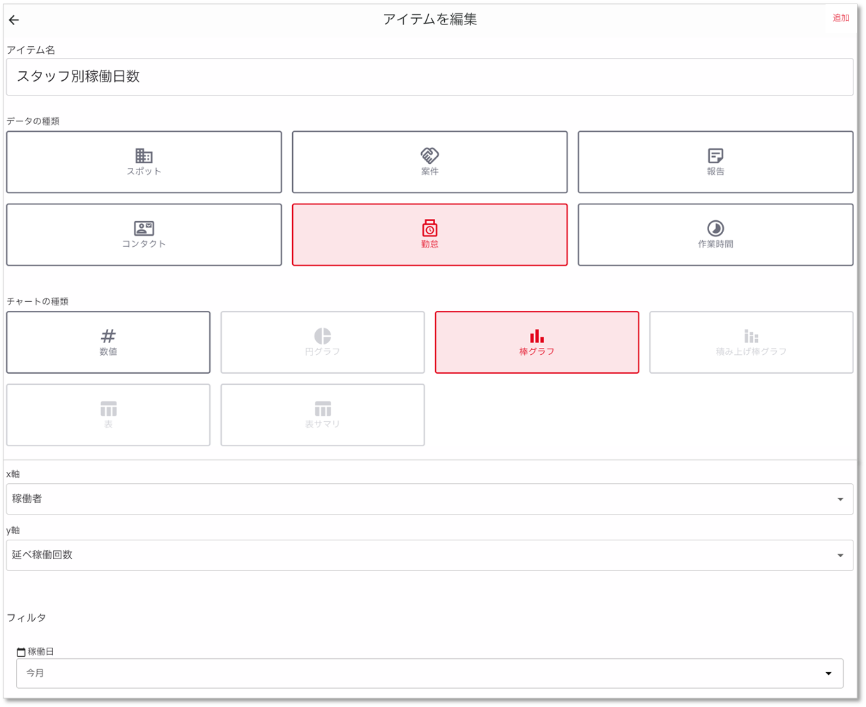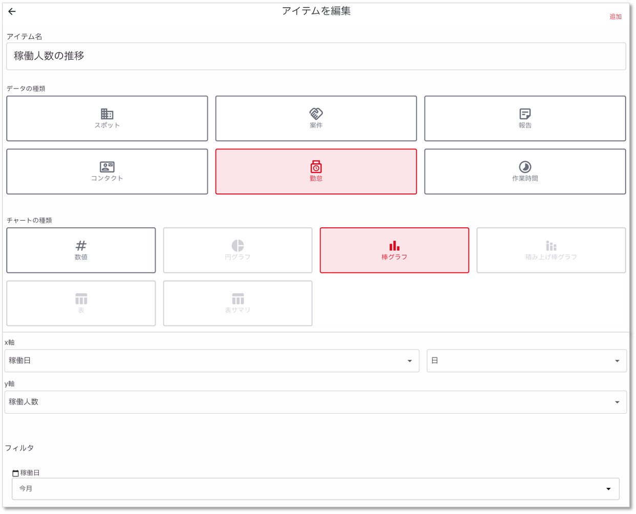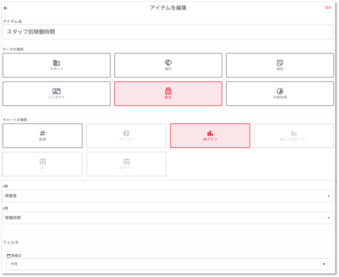 - 「アイテムを追加」をクリックし、以下設定を行います。