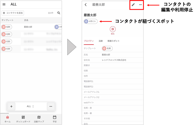 コンタクト一覧が表示されるので、確認したいコンタクトを選択します。コンタクトの内容は編集ができます。不要になったコンタクトは画面右上の「…」から利用停止にできます。