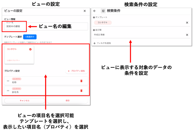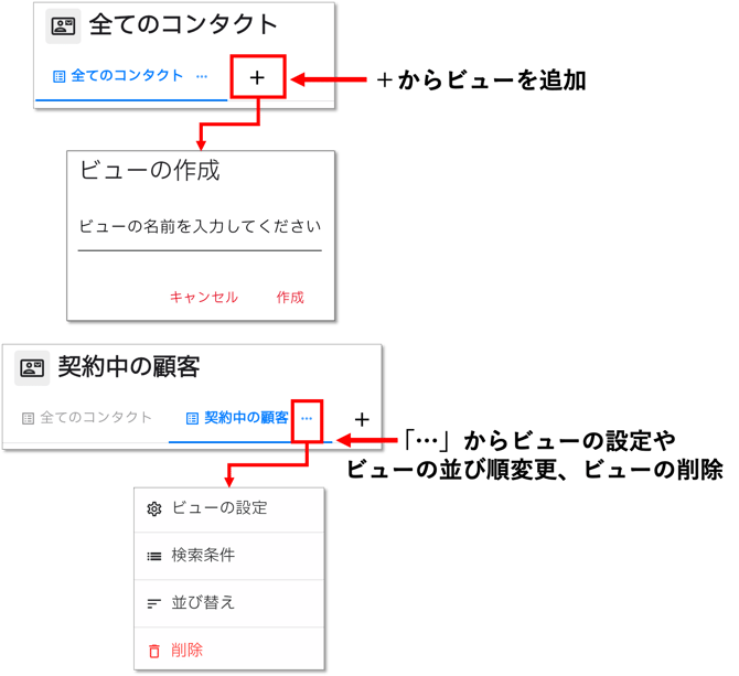 コンタクト画面では、「ビュー」を作成することができます。見たい項目や条件にあわせて複数ビューを作成し、状況に応じてビューを切り替えながらコンタクトを確認できます。