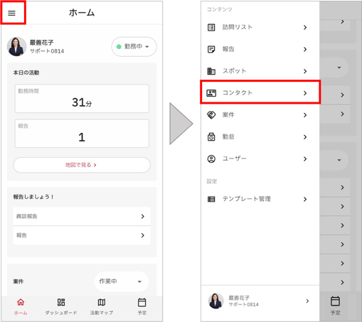 コンタクトは、cyzen pro左上の「≡」内にある「コンタクト」メニューから開くことができます。※PCでご利用中の場合は、画面左側に「コンタクト」が表示されています。