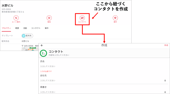 スポット詳細画面から、そのスポットに紐づくコンタクトを作成することができます。