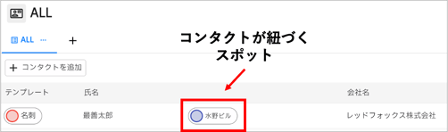 - スポットに紐づくコンタクトは、コンタクト一覧で紐づくスポットが表示されます。