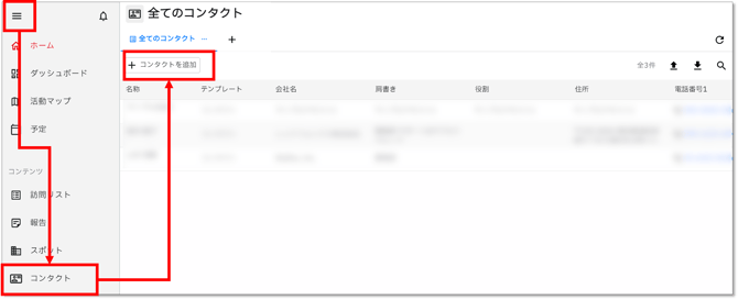 - ログインし、メニューからコンタクト画面を開きます。
