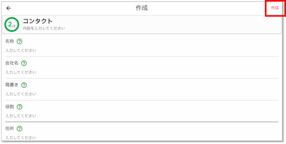 - 必要項目を入力・確認後、右上の「作成」でコンタクトの追加完了です。