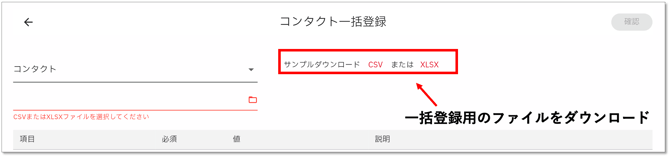 - 一括登録用のファイルをダウンロードします。対象のテンプレートを選んで、CSVもしくはXLSXファイルをクリックします。