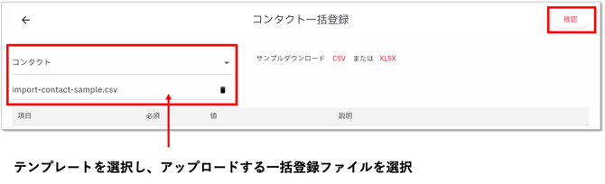 - サンプルファイルに登録内容を設定したら、コンタクト一括登録画面で再度テンプレートを選択し、ファイルをアップロードします。