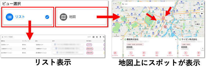 スポット、訪問リスト、案件、報告、コンタクト、ユーザーの画面では、ビューを作成して、見たい観点でカスタマイズしてデータを確認することができます。(作成したビューはメンバー全員に共有されます)
