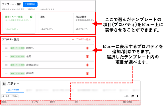 - テンプレート選択・プロパティ設定:ビューの項目を設定できます。「テンプレート選択」で選択したテンプレートの項目が「プロパティ設定」に表示されるので、並び替えたり、追加・削除してビューの項目を決めてください。