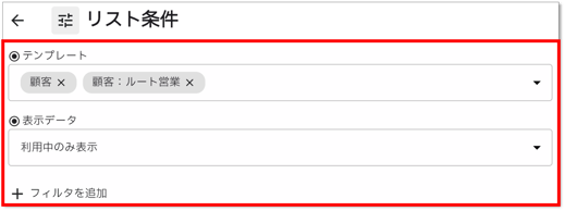 リスト条件は、ビューに表示する対象レコードの絞り込みを行います。テンプレートや利用状況で絞り込んだり、「フィルタを追加」からテンプレート内の項目を絞り込み条件に追加することもできます。