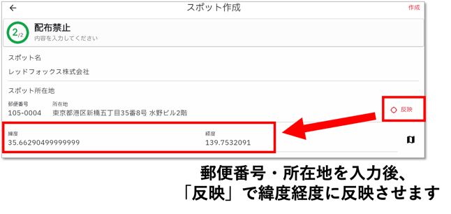 所在地を入力しただけでは登録できません。必ず「反映」をクリックして 緯度・経度に反映 させてから「作成」を押してください。