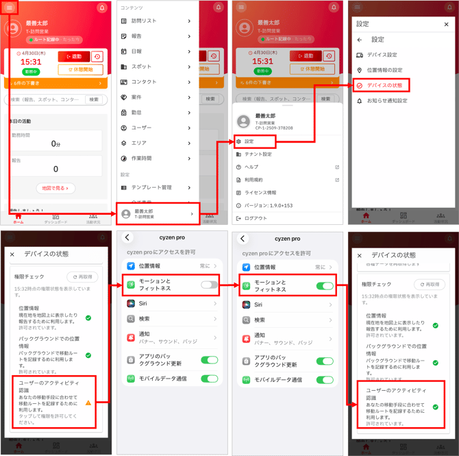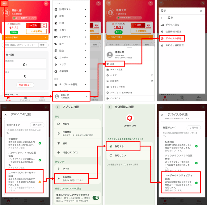 - [設定]>[デバイスの状態]>[ユーザーのアクティビティ認識]が許可されていない場合、この項目をタップし、権限の許可を行います。