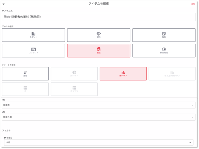 - アイテム名:勤怠-稼働者の推移(稼働日)