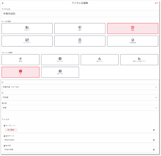 - チャートの種類:表