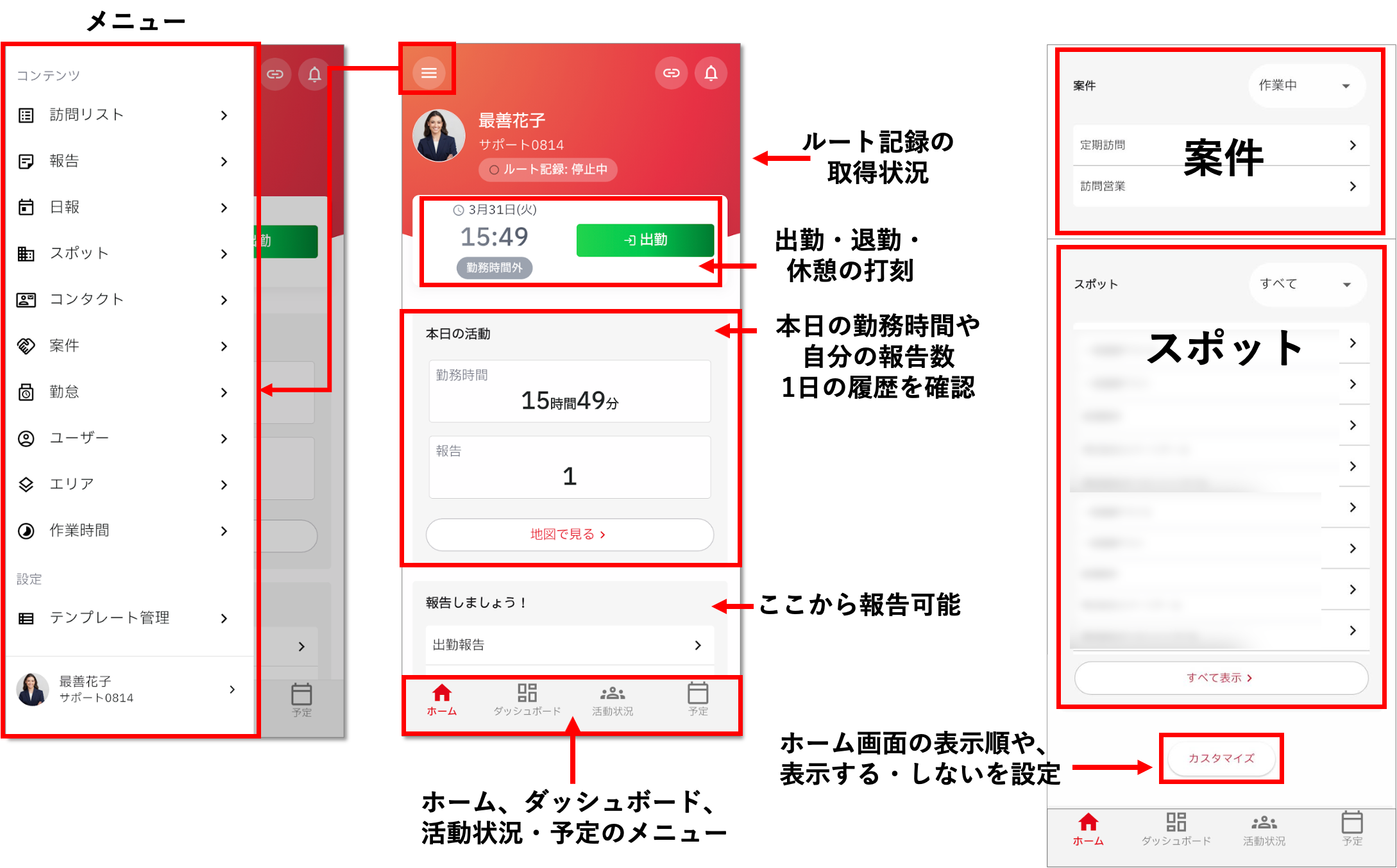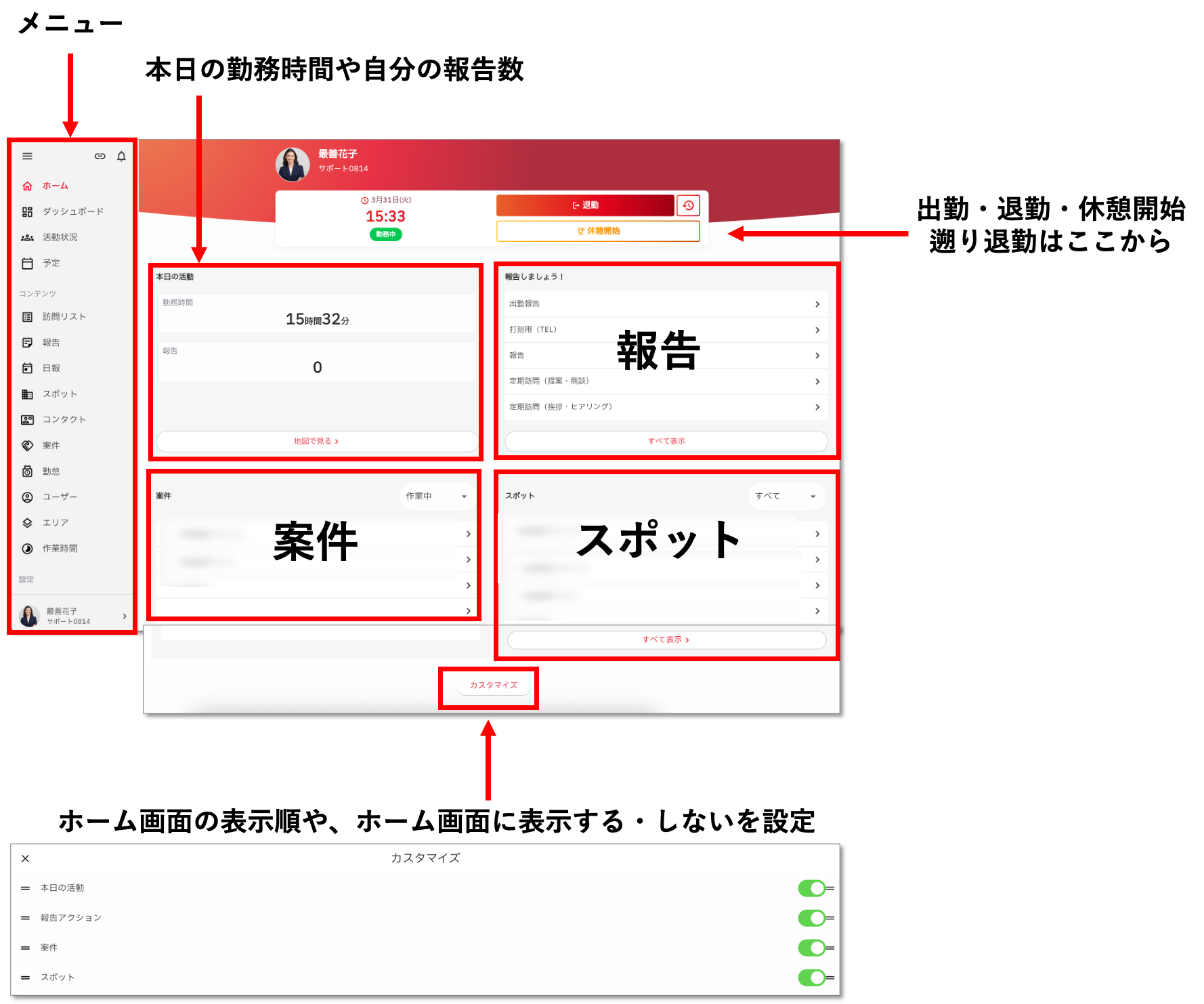 【cyzen pro】ホーム画面について ※この記事はcyzen pro 利用者向けです cyzen proのホーム画面について説明します。 PCでログインしている場合とスマートフォンでログインしている場合で少し見え方が異なります。 PCの場合(クリックで拡大表示) スマホの場合(クリックで拡大)