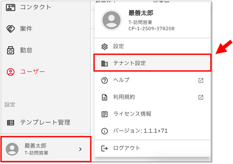 - ログイン後、メニュー最下部の自身のアカウント名が表示されている部分をクリックし、「テナント設定」をクリックします。