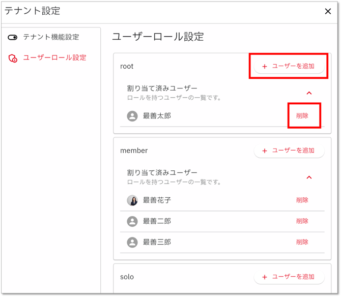 - 「ユーザーロール設定」画面にし、権限ごとに「ユーザーを追加」や「削除」ができます。