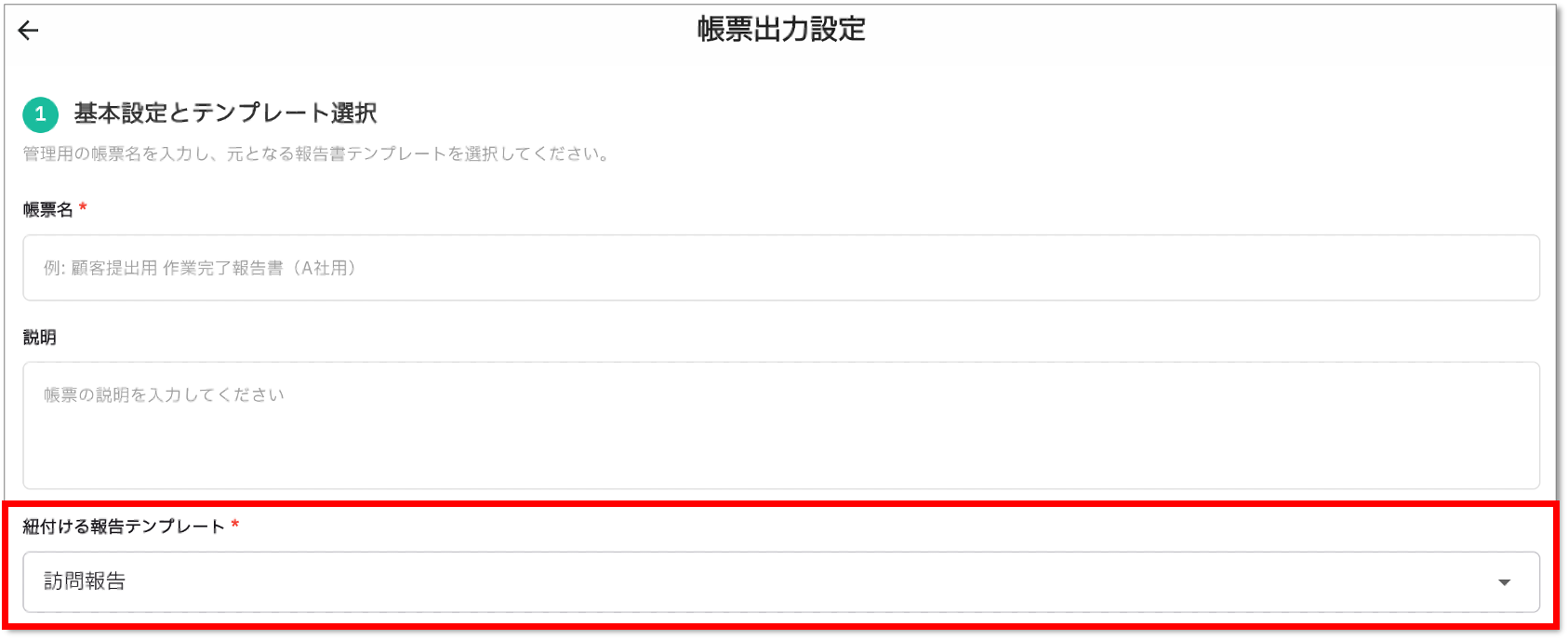 「帳票出力設定」が開きます。「①基本設定とテンプレート選択」で帳票名と帳票の説明、手順1で決めた報告テンプレートをプルダウンから選択してください。