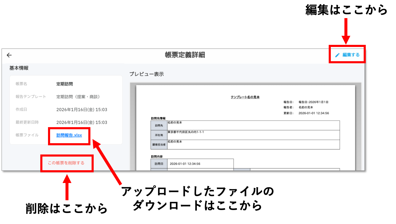 「帳票定義詳細」画面が開くので、「編集する」や「この帳票を削除する」ボタンで操作します。登録済の帳票ファイルをダウンロードすることもできます。