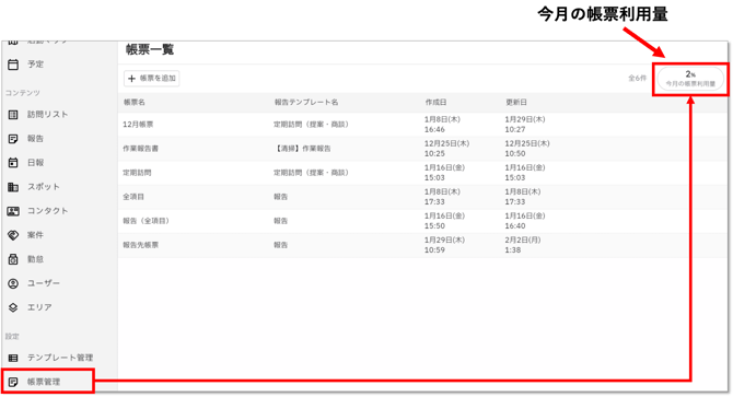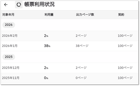 「今月の帳票利用量」をクリックすると、過去の利用量や契約ページ数を月毎に確認することができます。