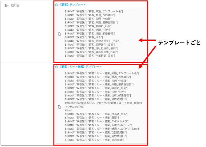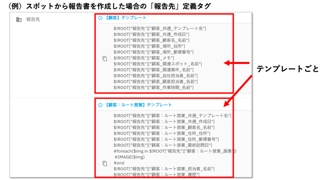 → 報告書内にスポット項目がある場合、スポットの定義タグは、スポットテンプレートの数だけ用意されます。コピーすると全項目がコピーされるので、帳票に表示する項目のみExcelに貼り付けてください。