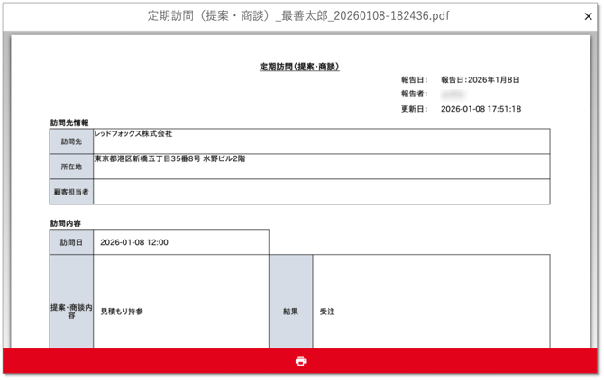 → cyzen proの報告書を スポット・案件・コンタクトから作成した場合、その 作成元(=報告先) の情報を帳票に出力できます。-