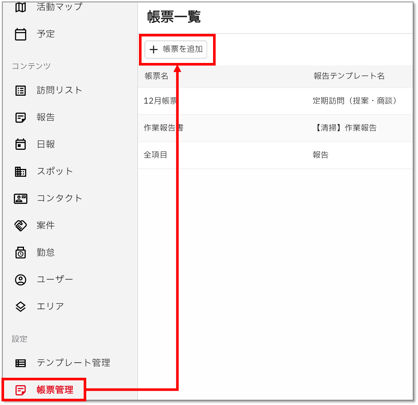 → 帳票出力設定を行う報告テンプレートを決めます。1つの報告テンプレートで複数種類の帳票を出力する場合は、帳票の数だけ設定を行ってください。 - Webでcyzen proにログインし、帳票設定 > 帳票一覧を開きます。「+帳票を追加」で設定を開始します。※ アプリでは帳票設定はできません。