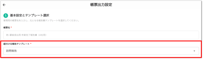「帳票出力設定」が開きます。「①基本設定とテンプレート選択」で帳票名と手順1で決めた報告テンプレートをプルダウンから選択してください。