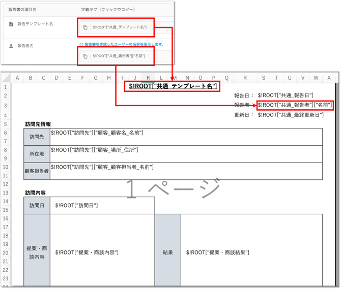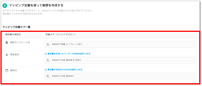 紐づける報告テンプレートを選択すると、「②マッピング定義を使って帳票を作成する」のマッピング定義タグ一覧に値が表示されます。