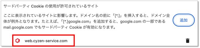 Chrome右上の[︙] > [設定] > [プライバシーとセキュリティ] > [サードパーティ Cookieの使用が許可されているサイト]で「追加」をクリック。