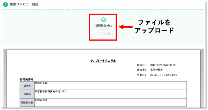 - 作成したフォーマットを「③帳票プレビュー確認」にアップロードし、プレビュー画面で表示に問題がないか確認します。表示に問題がある場合は、再度Excel帳票フォーマットを修正し、アップロードし直してください。