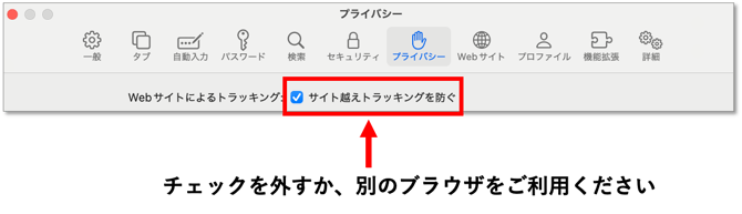 → 「サイト越えトラッキングを防ぐ」が有効になっている場合はファイル添付やPDFの表示が利用できません。Chromeなどの別のブラウザをご利用ください。