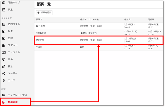 帳票フォーマットを編集・削除する場合は、帳票設定で帳票一覧を開き、対象の帳票を選択します。