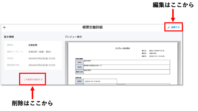 「帳票定義詳細」画面が開くので、「編集する」や「この帳票を削除する」ボタンで操作します。