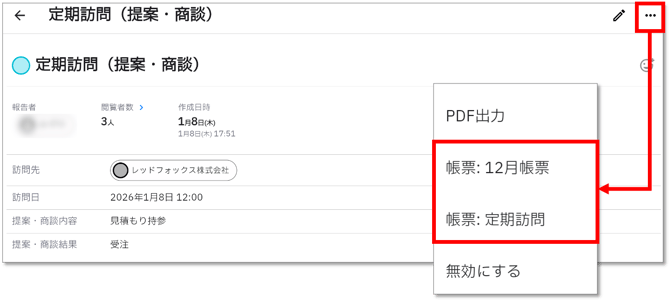 帳票出力は、帳票フォーマットを作成した対象の報告テンプレートを使った報告を開き、右上の「…」から出力する帳票名を選択します。(1つの報告テンプレートで複数の帳票を設定している場合は複数の帳票名が表示されます。)