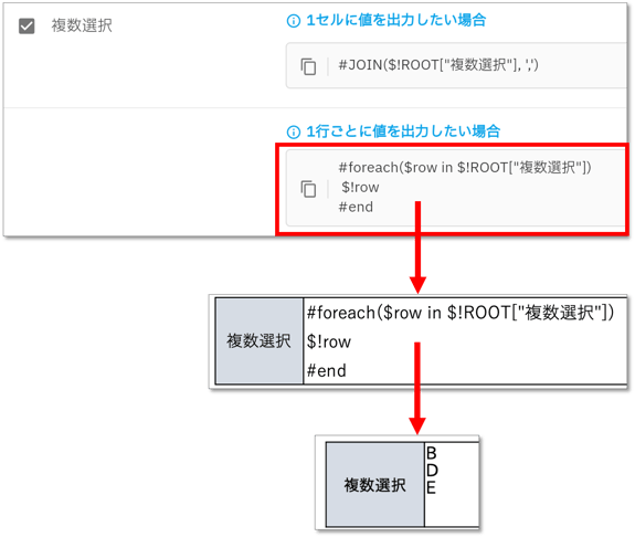 → 選択肢で複数選択可にしている場合、帳票出力方法は2パターンから選べます。