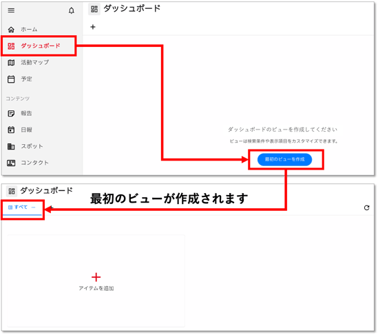 最初はビューが何もない状態なので、「最初のビューを作成」からビューを作成します。