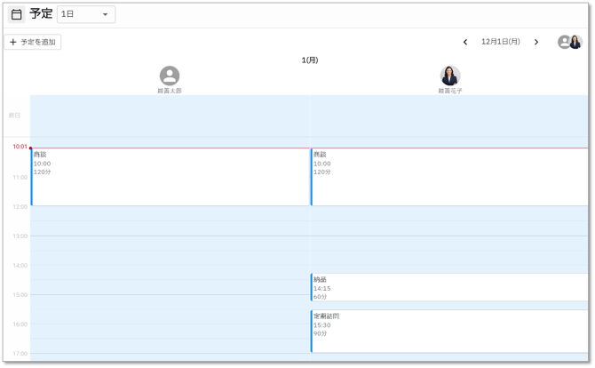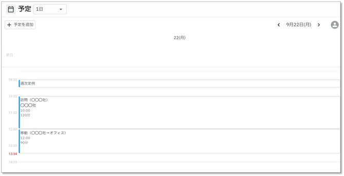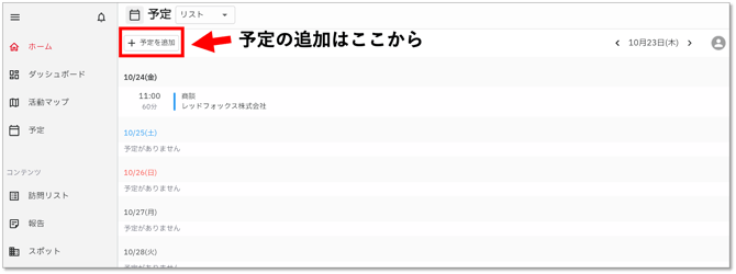 - 予定画面上部の「+予定を追加」をクリックすると予定を作成画面が開きます。