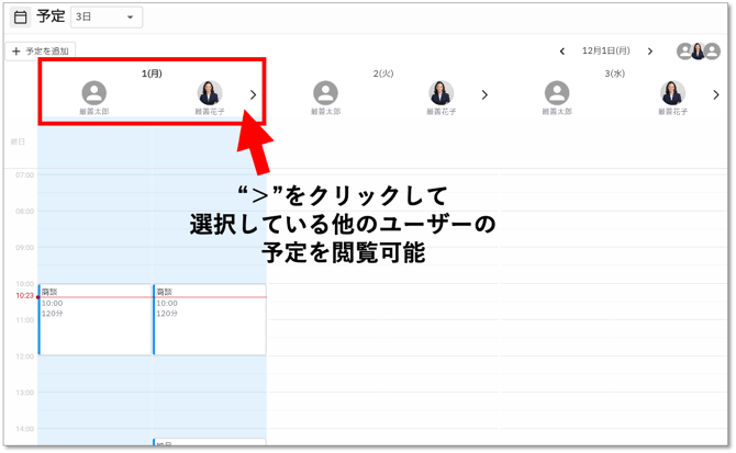 Web画面では横並びに表示され、人数が多い場合は"<>"で切り替えてユーザーごとの予定を見ることができます。