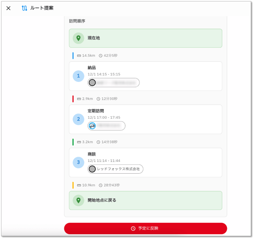 移動手段や開始・終了地点を選択し、「ルート提案」をクリックします。訪問順序が提案されるので、問題なければ「予定に反映」をクリックしてください。