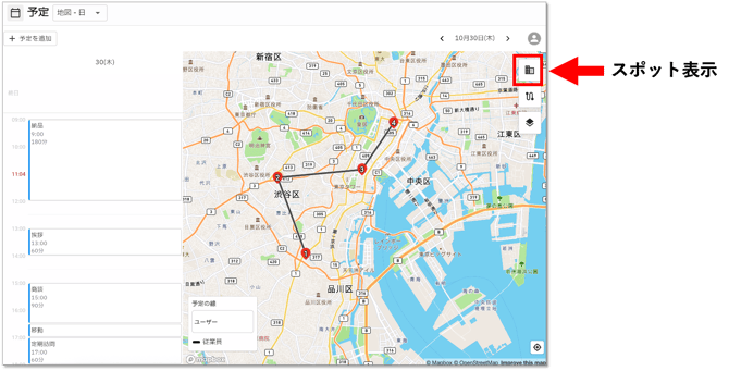 複数ユーザーを選択している場合、選択したすべてのユーザーの予定がまとめて表示されます。 - 地図-日:1日の予定を順番に番号をつけて地図上に表示します。